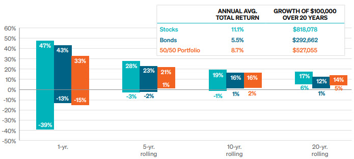 Volatility in equity markets can be expected, with an average annual drop of 10%. Clients should maintain a longer-term perspective and recognize that interest rates may decrease looking forward. It is crucial to stick to your plan and maintain a longer time horizon. The graph below illustrates the returns of stocks, bonds, and a balanced 50/50 portfolio over a one-year period, with green representing the S&P 500 Index and blue representing the Bloomberg U.S. Aggregate Bond Index. The grey bars represent a balanced portfolio. Returns vary significantly over one year, but over five, ten, and twenty years, the range of outcomes is substantially reduced. For instance, a balanced portfolio over five years has never had a negative return over the analysis period. Clients must have a long-term investment horizon and ensure they are in the appropriate risk profile. While there may be increased volatility over one year, this can also create investment opportunities.