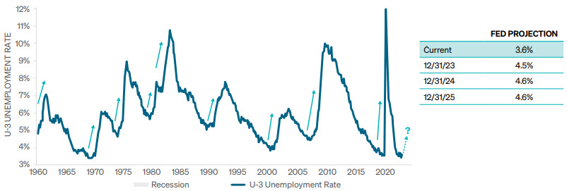 The Fed closely monitors unemployment and inflation to assess whether they need to change course. While inflation peaked at 9.1% in June of 2022 and has since declined for nine months, employment remains tight. The chart below shows the unemployment rate dating back to 1960, with recessions shaded in grey. As of the latest data, the current unemployment rate stands at 3.5%, which is close to a 50-year low.