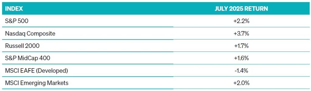 After a volatile first half of 2025 dominated by tariff headlines, slowing GDP, and policy uncertainty, July offered a welcome shift toward market stability. While risks remain—from geopolitical flashpoints to potential credit downgrades—investors are finding renewed confidence in earnings and inflation moderation, while recent labor market data is providing some concern about the soft landing. As always, we continue to advocate for a balanced, disciplined approach and remain watchful for signs of shifting momentum across sectors and asset classes.