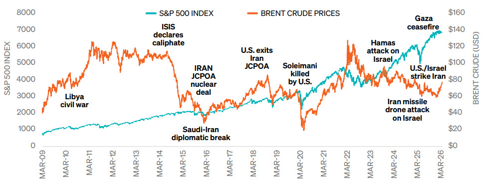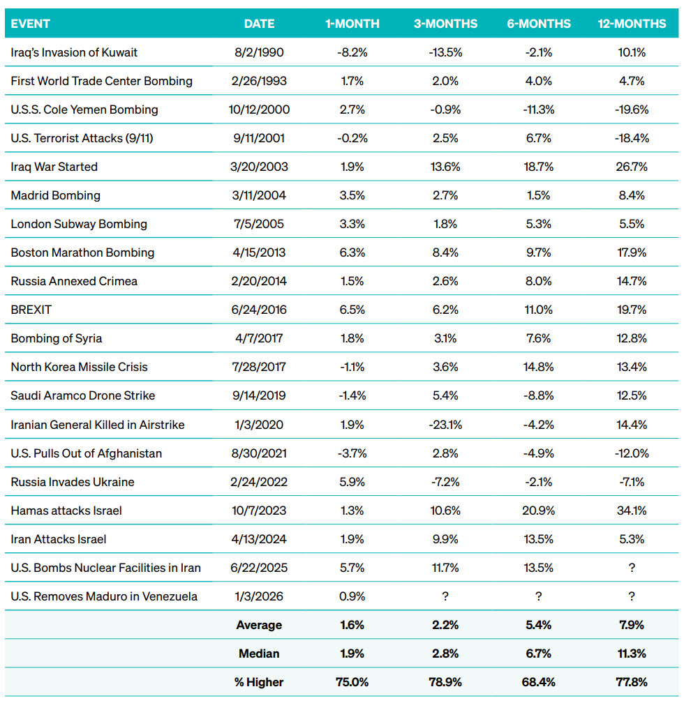 History suggests that economic fundamentals tend to have a larger impact on long-term stock market returns than geopolitical shocks. While short-term volatility is common, the data shows that markets have historically recovered and moved higher in a majority of the cases within 6 to 12 months.