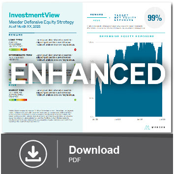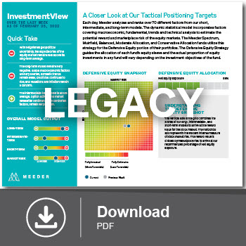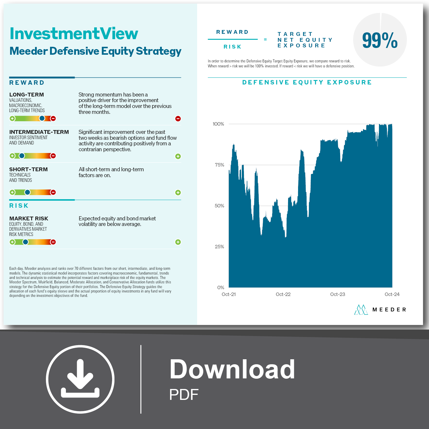 Each day, Meeder analyzes and ranks over 70 different factors from our short, intermediate, and long-term models. The dynamic statistical model incorporates factors covering macroeconomic, fundamental, trends and technical analysis to estimate the potential reward and marketplace risk of the equity markets. The Meeder Spectrum, Muirfield, Balanced, Moderate Allocation, and Conservative Allocation funds utilize this strategy for the Defensive Equity portion of their portfolios. The Defensive Equity Strategy guides the allocation of each fund’s equity sleeve and the actual proportion of equity investments in any fund will vary depending on the investment objectives of the fund.